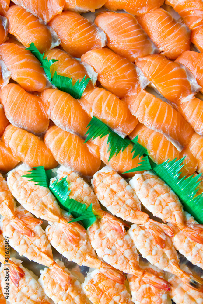 Row of shushi fresh shrimp and salmon