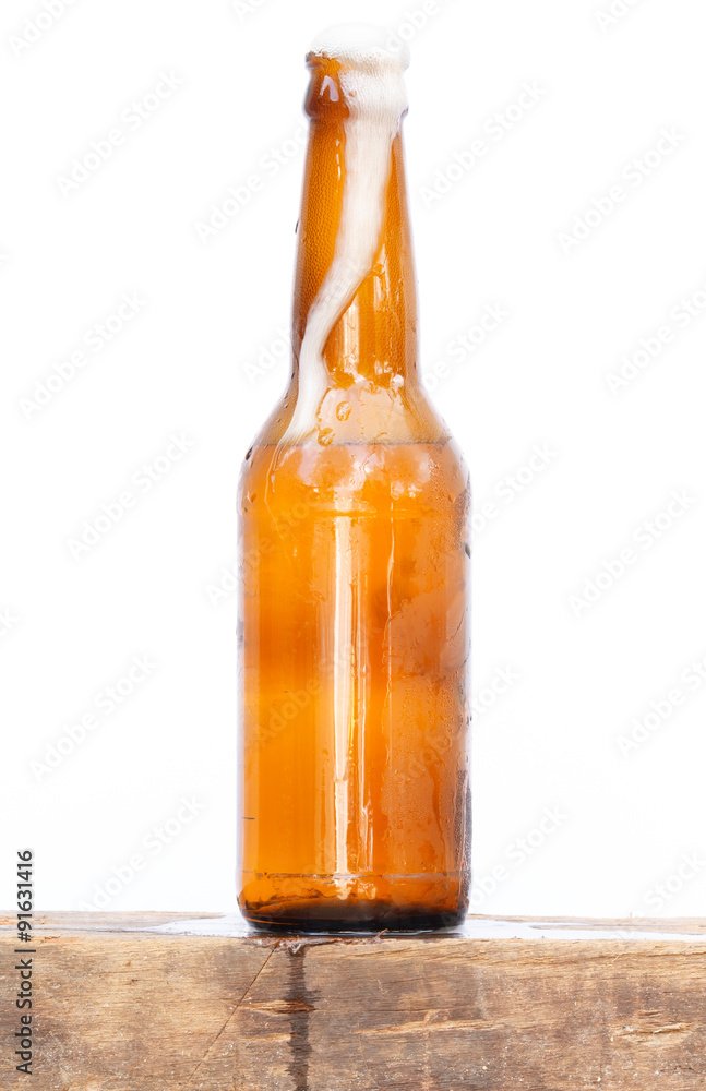 International beer day with foam of beer flow over cool bottle.