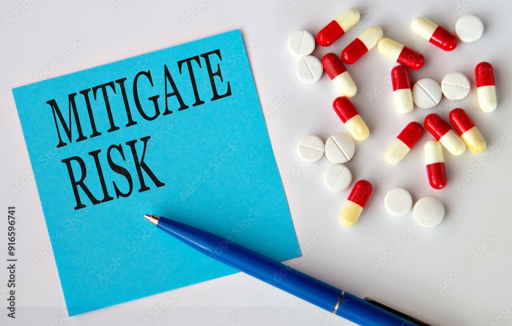 MITIGATE RISK - word on blue paper on a white background with colorful pills