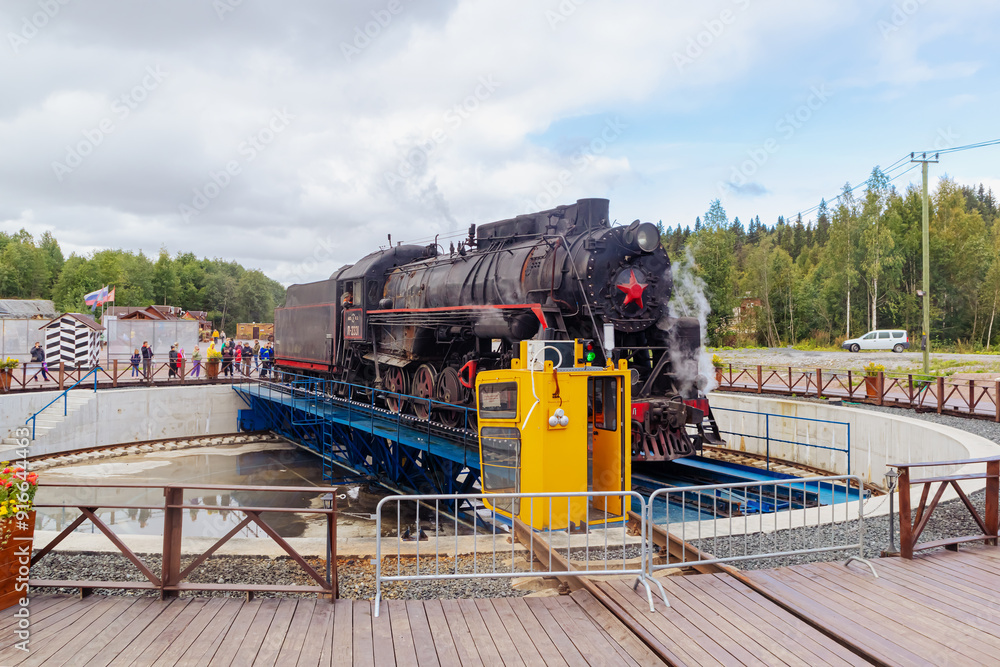 The retro locomotive turns around on a special platform. Ruskeala, Karelia, Russia - September 2, 2022.