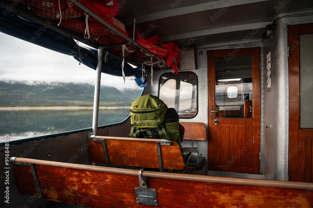 Still life of a backpack packed for outdoor adventure standing on the wooden bench of classical boat interior on the boat ride over Akkajaure from Ritsem to Padjelanta in Swedish Lapland