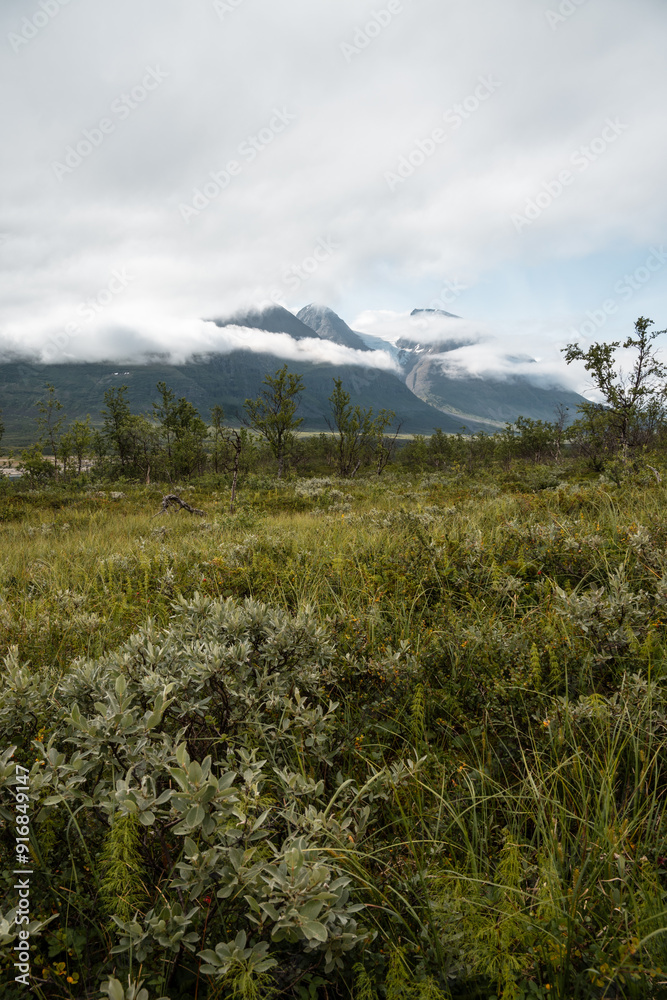 Beautiful shot of arctic landscape in Swedish Lapland Mountain National Parks (on Padjelantaleden between Stora Sjöfallet and Padjelanta). Birches in front. Mystical clouded Mountains in background.