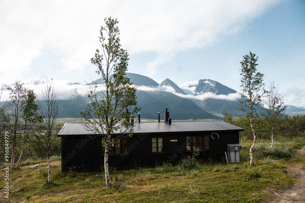 Akkastugorna, Swedish Lapland, Sweden - Cabin for Hikers on Padjelantaleden in National Park Stora Sjöfallet. Blue sky and Mount Akka in mystical clouds. birch tree forest in front.