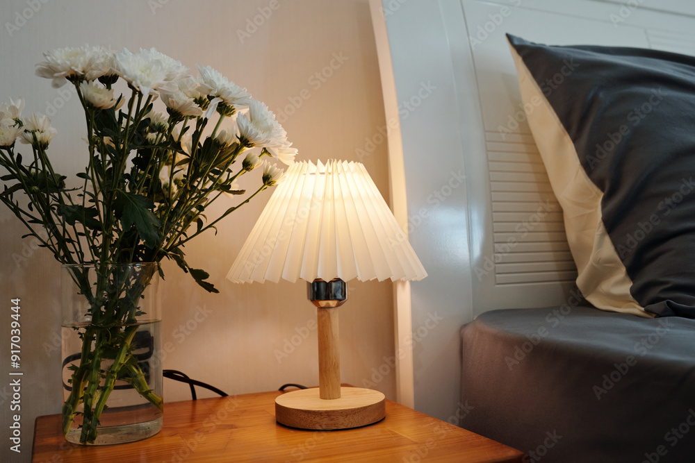 Close-up of bedside table with lamp and bouquet of flowers in bedroom