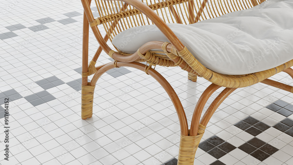 Close-up photo of a rattan chair with white cushions. On a white tile floor with a black and white grid pattern.3d, rendering, illustration,
