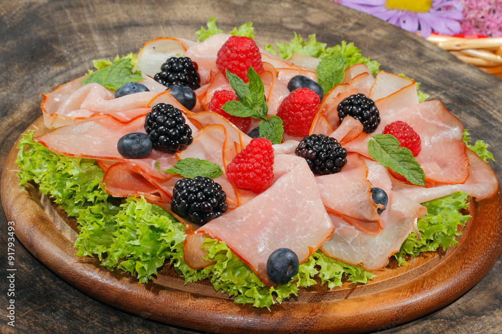 Schinkenplatte, Schinken, Früchte, Himbeeren, Blaubeeren, Brombe