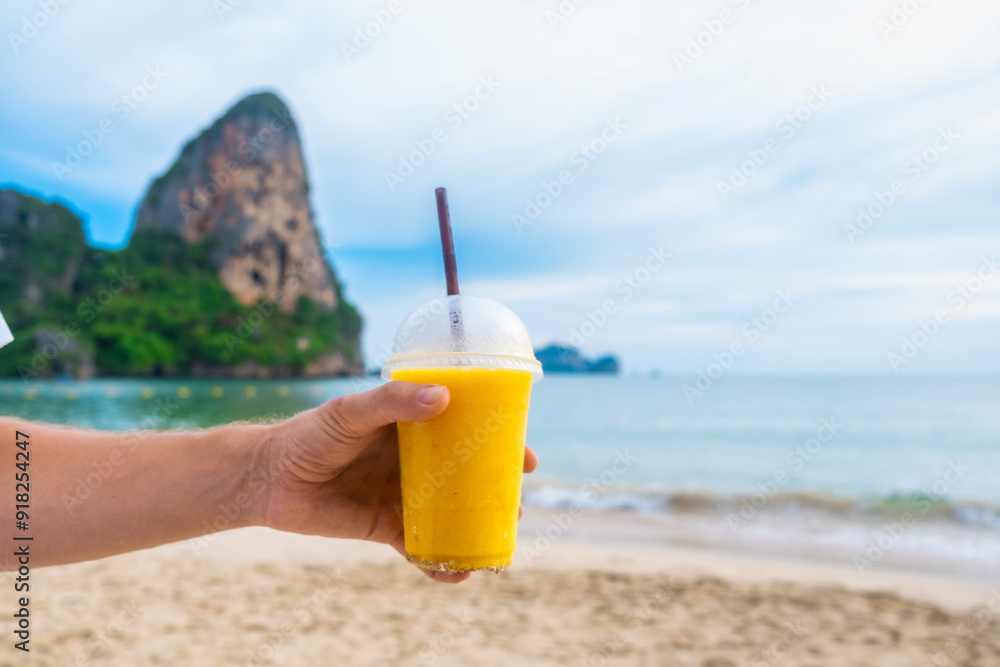Man holding yellow mango smoothie on tropical sandy Railay beach with cliffs in the background at Krabi province, Thailand. Male hand holds refreshment summer drink in plastic cup with a straw