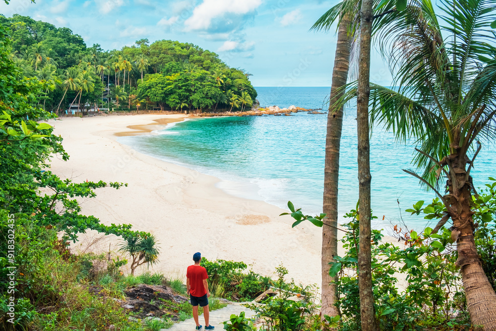 Man tourist stand on stone steps over tropical sandy beach with turquoise water ocean. Male traveler walking down to Freedom beach in Phuket island, Thailand with nobody. Summer vacation in Asia