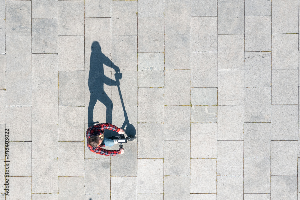 Top view of man riding electric scooter on paved surface casting shadow in the city at sunny summer day. Overhead view of male driving e-scooter outdoors. Artistic and minimalictic shot from drone