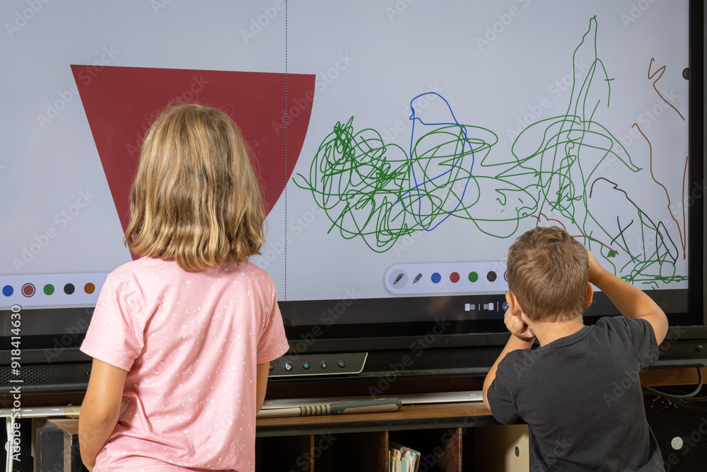 A school boy and a girl are looking at a large computer screen with a drawing on it. The drawing is messy and colorful, with a lot of different colors and shapes. Scene is playful and creative
