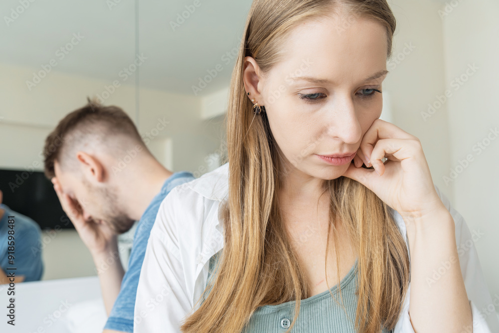 Unhappy, sad and upset couple in argument with disappointed woman looking down and her man on background after conflict and quarrel. Angry girl thinking of relationship problems with boyfriend