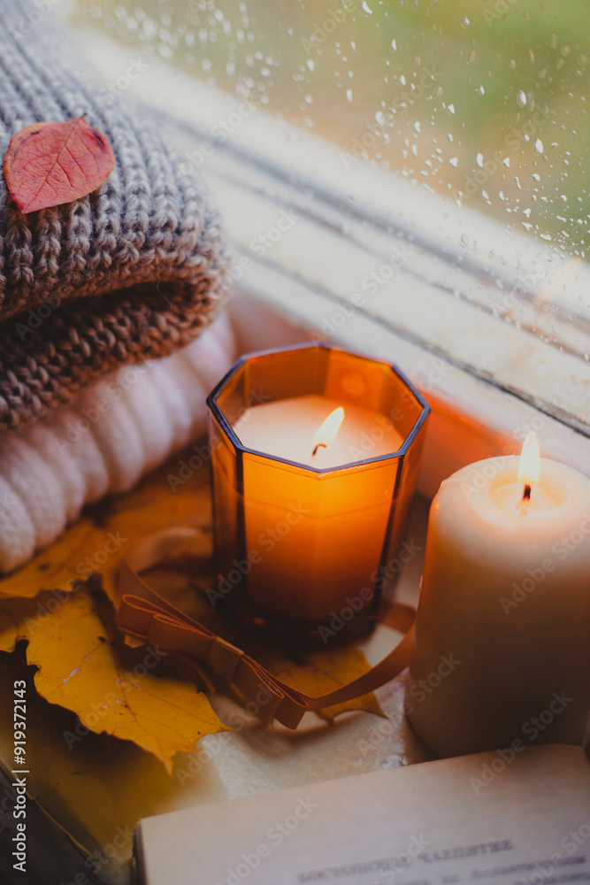 A burning candle on the window is autumn . the comfort of home . autumn comfort . autumn mood. The chondra .