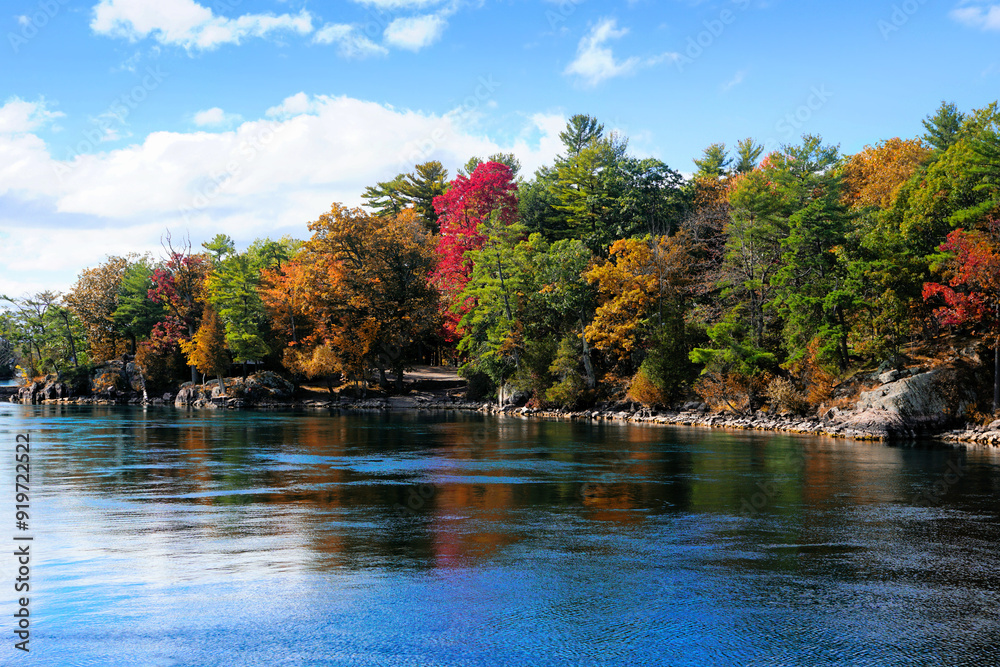 Beautiful landscape of the Thousand Islands along the Canada USA border during autumn with fall colors