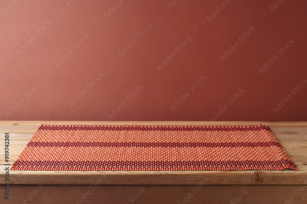 Empty wooden table with bamboo place mat over brown wall background. Kitchen mock up for design and product display