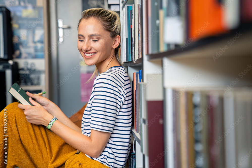 A smiling young woman with light hair, dressed casually, engrossed in a book while sitting comfortably against a bookshelf on the library floor.
