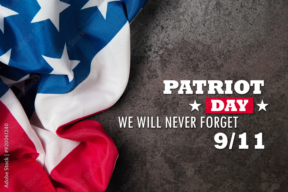 Patriot Day inscription with USA flag on rusty iron background. Patriot Day.