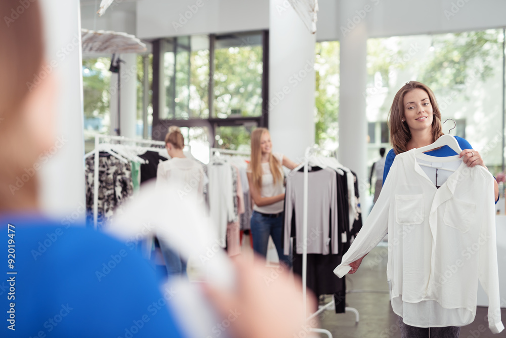 kundin im laden schaut sich eine weiße bluse an