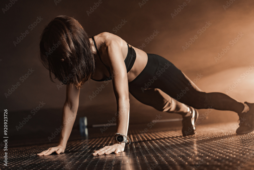 A dedicated female fitness model is engaging in a powerful pushup workout in a dramatic and intense gym setting, showcasing her determination and strength while inspiring others to pursue fitness