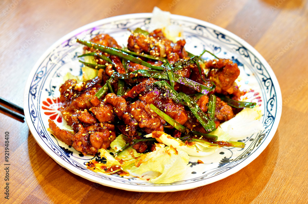 식탁 위에 깐풍기를 젓가락으로 먹는 모습