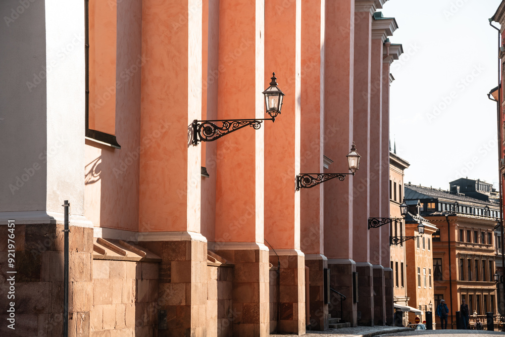 Stockholm, Gamla Stan, Sweden - July 27, 2024, Historical Lanterns in an picturesque alley next to Kungliga slottet. Rosé painted historical european architechture.