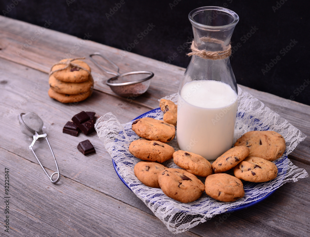 Bottle of milk with cookies and some ingredients on rustic table