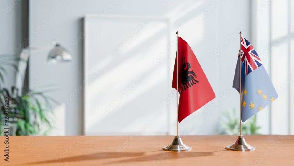 FLAGS OF ALBANIA AND TUVALU ON TABLE