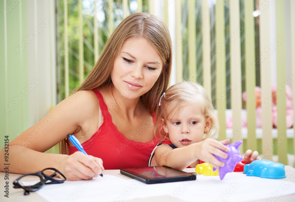 Young busy female telecommuting while her child is playing with toys. Pretty mom with cute daughter checking family bills and documents.