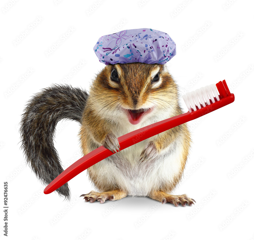 Funny chipmunk with toothbrush and shower cap, isolated on white