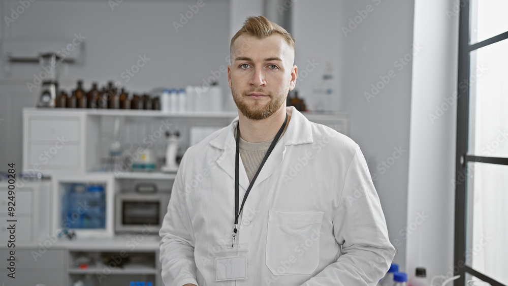 A young bearded man wearing a lab coat stands confidently in a modern laboratory setting with equipment in the background.