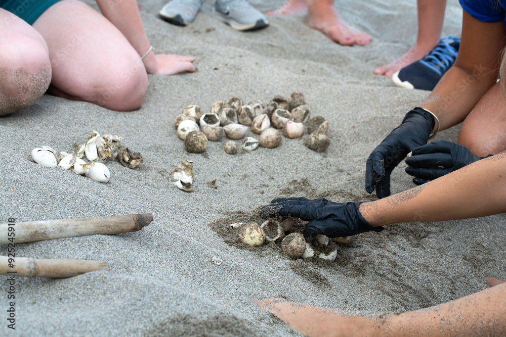Volunteers collecting empty Caretta caretta sea turtle eggshells on the beach