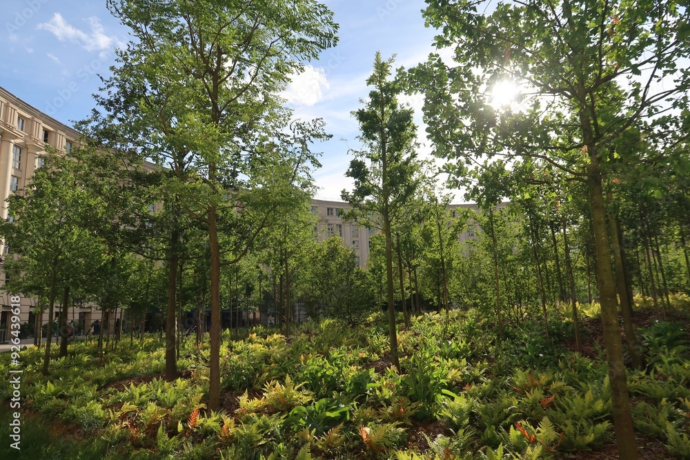 Vue sur les arbres de la forêt urbaine de la place de Catalogne, à Paris, en été (France)