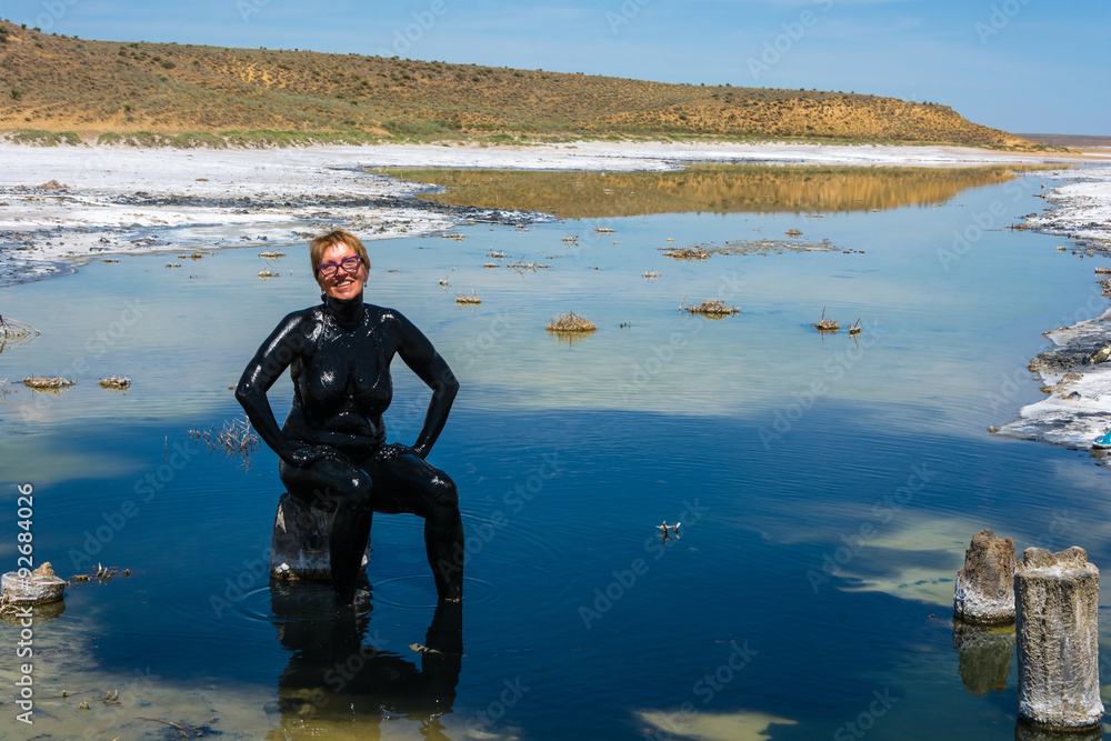 The woman accepts the curative mud baths on the lake Baskunchak.