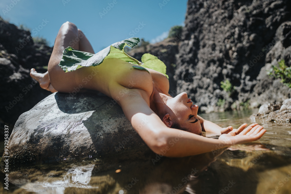 Woman lies on a rock covered with a leaf, enjoying the sun and nature in a serene outdoor stream setting.