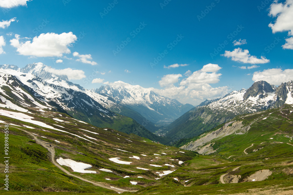 Picturesque panoramic view of the snowy Alps mountains, the Mont Blanc mountain and glacier and meadows while hiking Tour du Mont Blanc. Popular hiking route. Alps, Chamonix-Mont-Blanc region, France