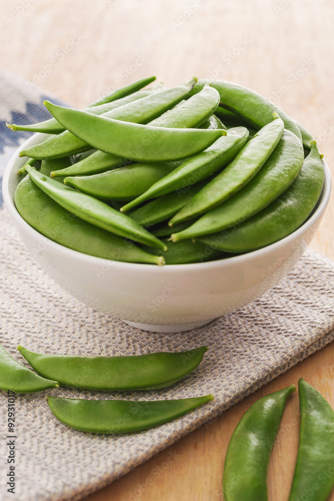 Fresh peas in a white bowl on wooden background