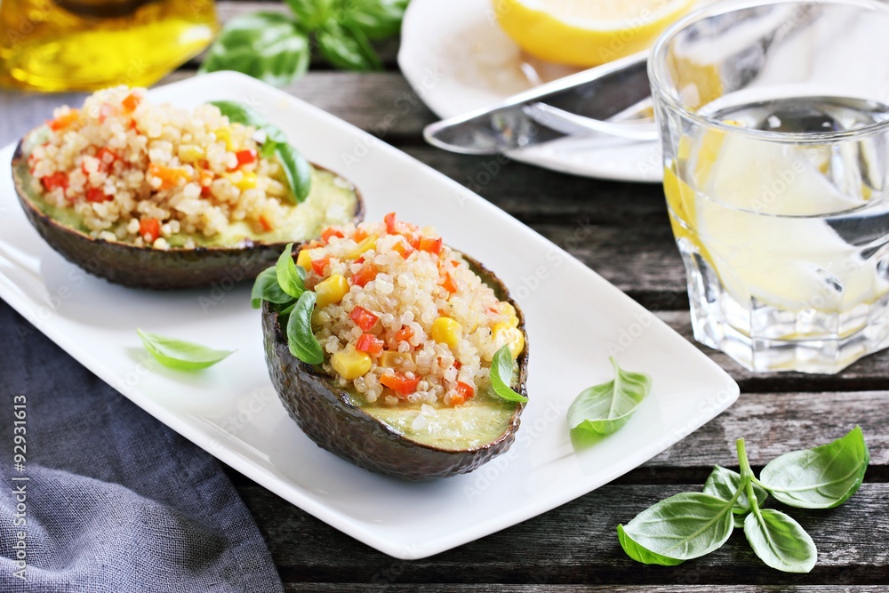 Grilled avocado staffed with quinoa vegetables salad.Selective focus
