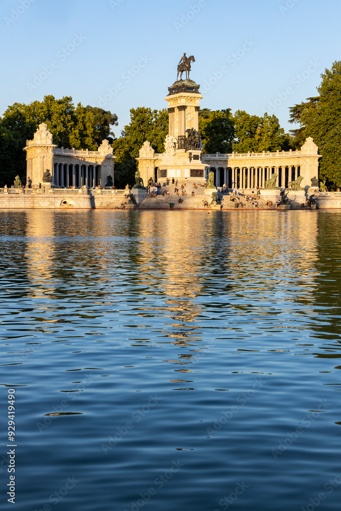 Retiro Park, Madrid, Spain. Crystal Palace, lake with swans, glass structure, architecture. Lake and temple on the horizon, fountains and decorated with colorful plants and flowers, family leisure.