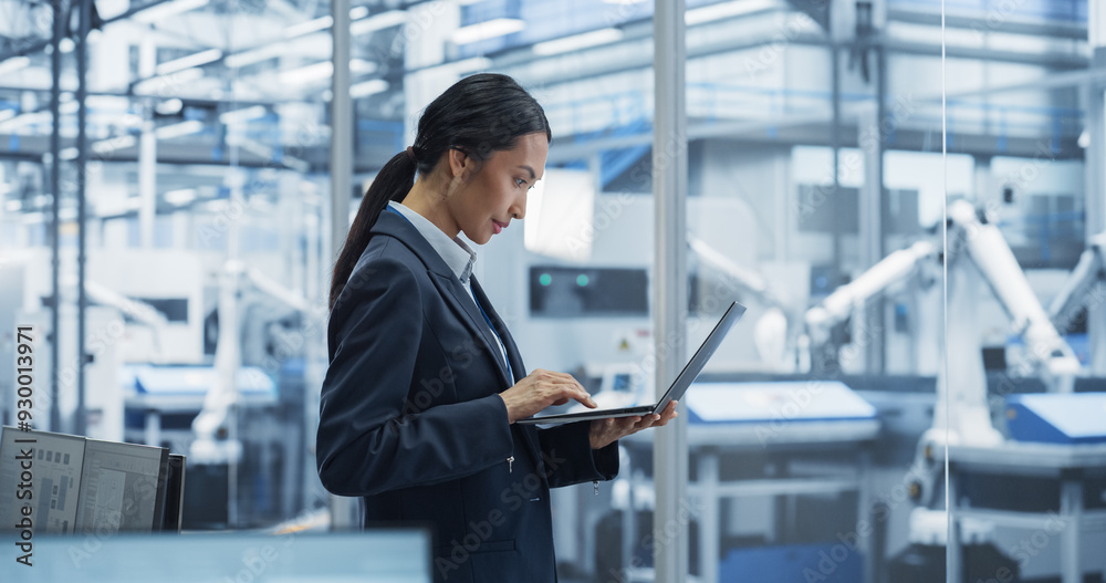Production Line Technician Working on a Laptop Computer at a Factory Office. Asian Female Software Specialist Updating Code for Machine Production and Assembly with Automated Robotic Arms