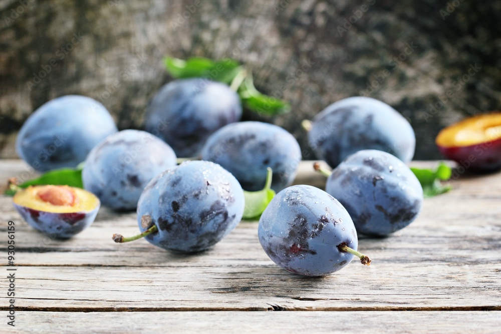 Fresh plums on a rustic wooden background.Selective focus.Toned image