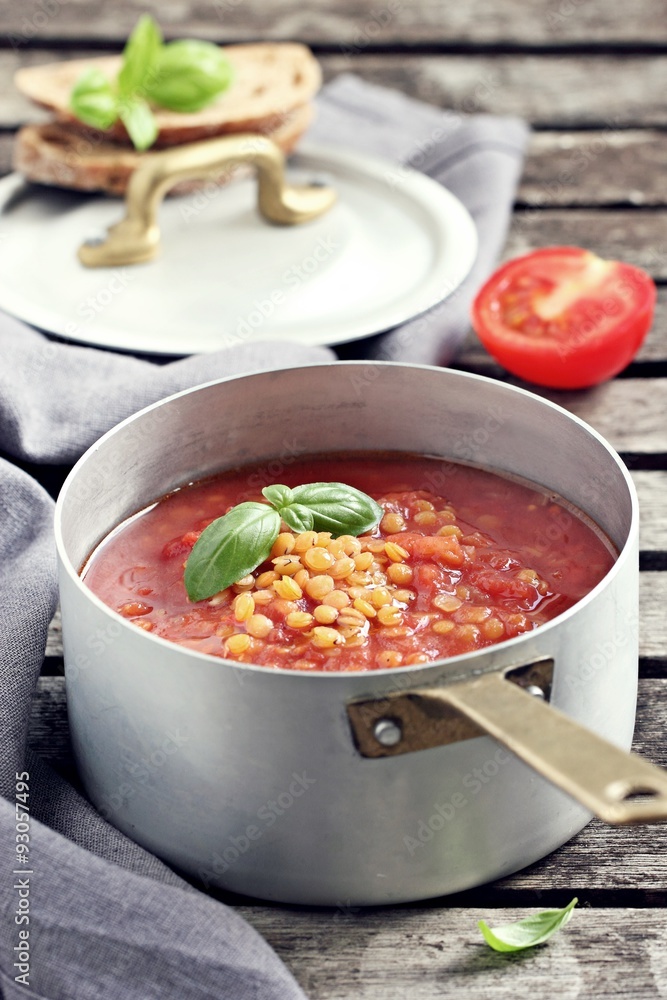 Tomato and lentil cream soup.Selective focus