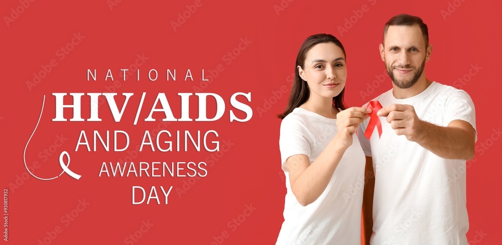 Banner for National HIV AIDS and Aging Awareness Day with young couple holding ribbon