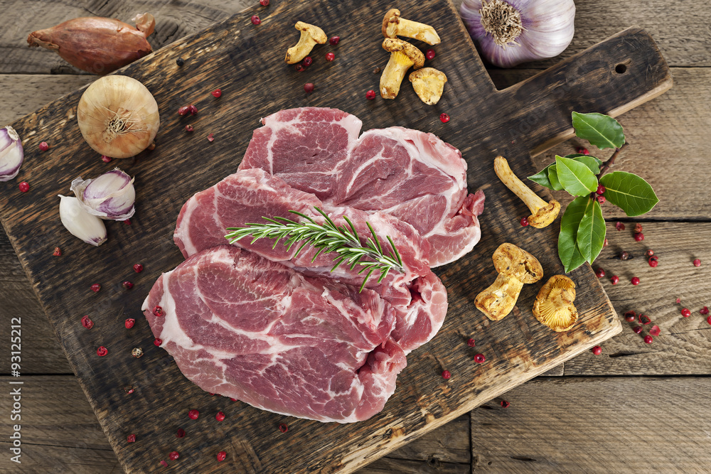 Marmoriertes rohes Nackensteak auf edlem Holzbrett