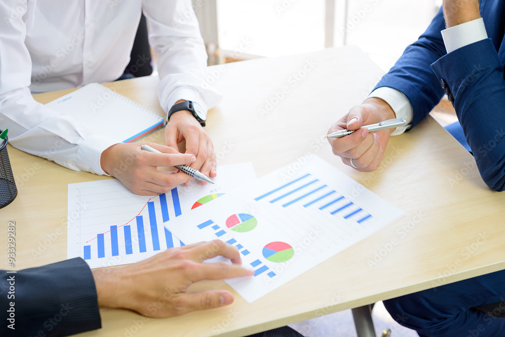 Business People Analyzing Financial Results on Graphs around the Table in Modern Office. Team Work Concept
