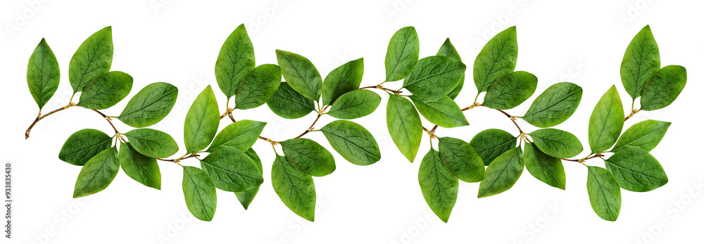 Twigs with green leaves (Cotoneaster lucidus) in a line arrangement isolated on white or transparent background