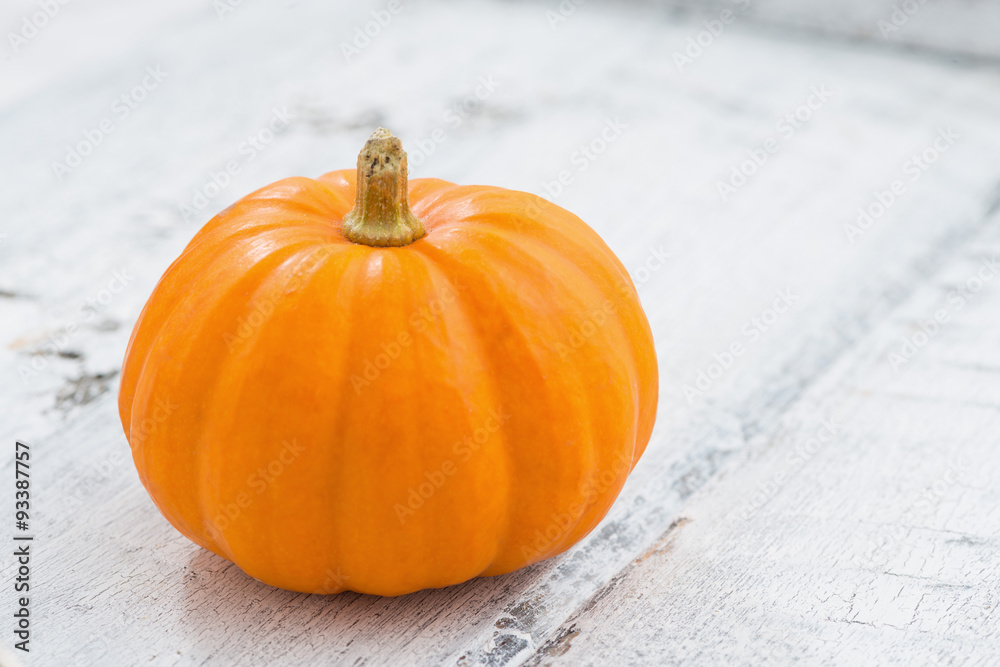 decorative orange pumpkin on a white wooden background