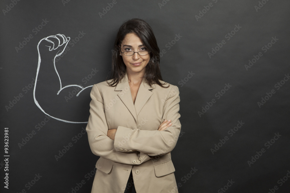 Bella ragazza con occhiali e giacca e braccio disegnato alle spalle