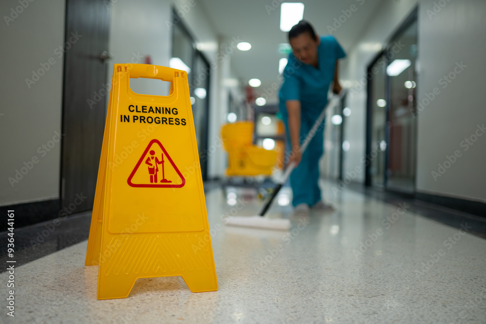 A woman is cleaning a floor with a yellow sign that says "cleaning in progress"