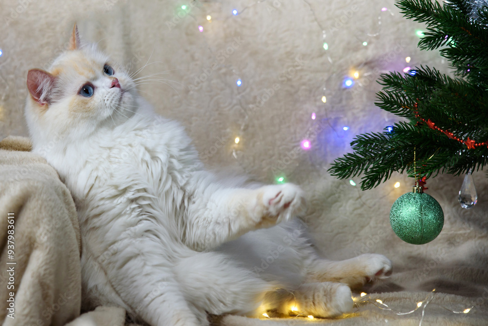 A white Persian cat sits next to a decorated Christmas tree. He's looking at Christmas toys. Playing with toys on the Christmas tree