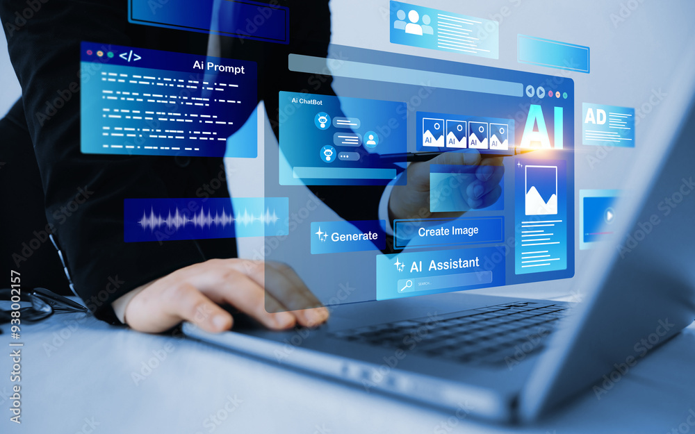 Interaction with the Ai assistant to solve some tasks more easily. Image generator, documents, marketing and advertising, bot writing and coding.Person using laptop with Ai Content Generator.