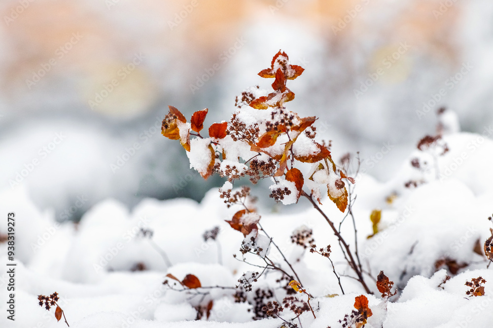Snow-covered branches of a bush with red dry leaves after snowfall
